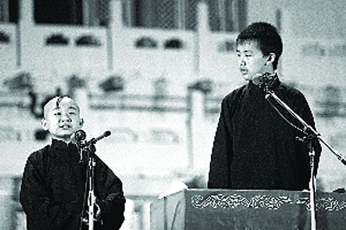 昨晚演出前大會(huì)堂門口的黃牛黨多數(shù)都在收票,演出開場(chǎng)后原價(jià)票依然還有人肯買。演出舞臺(tái)裝飾成天壇的樣子,讓北京觀眾感到相當(dāng)親切。郭德綱兒子郭麒麟和義子陶陽開場(chǎng)就說了《學(xué)雜唱》,這個(gè)段子主要表現(xiàn)演員對(duì)各種戲曲唱段掌握程度,比相聲臺(tái)高一點(diǎn)點(diǎn)的郭麒麟不僅將梅葆玖、袁世海等名角唱腔模仿得很像,而且現(xiàn)場(chǎng)還唱起了流行歌曲,此外口才也相當(dāng)了得,不少觀眾感嘆“還是有郭德綱的遺傳基因,天賦不俗!