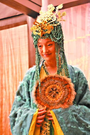周迅說(shuō),她在《孔子》中和周潤(rùn)發(fā)只有一場(chǎng)戲。雖然戲份少,但華服卻讓她大開(kāi)眼界!拔抑荒苡镁聛(lái)形容這件衣服,紗裙是孔雀羽毛做成的;頭飾都是由一顆顆的小石頭串起來(lái)的,差不多有10斤重,時(shí)間長(zhǎng)了我的脖子都承受不了,還得有人幫忙扶著。”