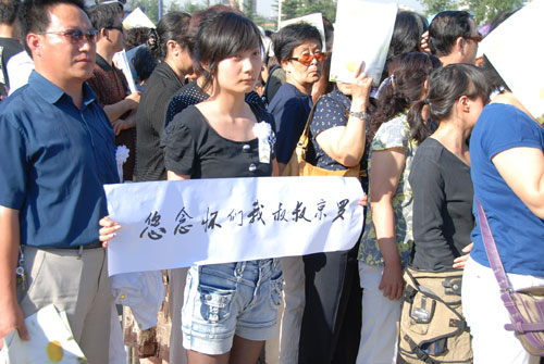 一名看起來80后的小姑娘手拿著橫幅“羅京叔叔我們懷念您”吸引大批媒體的目光,穿著牛仔短褲的她,低聲不語,站在原地數(shù)分鐘,仍由拍照。