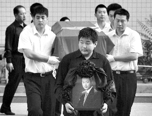 追悼會現(xiàn)場,水晶玻璃棺材四周布置著上萬朵百合花、白玫瑰花,靈堂肅穆安靜,羅京身著黑色西服、彩色領(lǐng)帶,遺態(tài)安詳。羅京妻子、愛子,以及所有親屬排成一列,陪伴羅京走完最后一程。羅京的妻子面容憔悴,低頭不語。靈堂外挽聯(lián)橫批“沉痛悼念羅京同志”。由于現(xiàn)場前來的群眾太多,工作人員不得不細(xì)心地提醒大家,“咱們就不鞠躬了,看一看羅老師就走,謝謝大家配合!