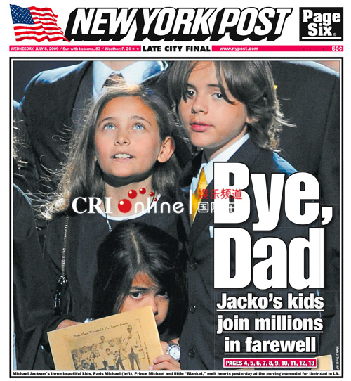2009年7月9日訊,洛杉磯,當?shù)貢r間7月7日,流行音樂之王邁克爾·杰克遜(Michael Jackson)的公眾悼念儀式在美國洛杉磯的斯臺普斯體育中心舉行。當?shù)貢r間7月8日,《紐約郵報》把杰克遜三遺孤的合影當做封面,孩子們泛紅的眼圈,哀傷的神情令人心酸。