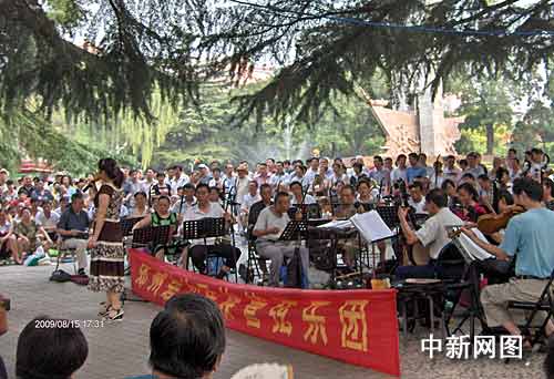 鄭州市碧沙崗公園,是為紀(jì)念北伐戰(zhàn)爭的烈士而修建的,而今成為人們休閑的主要場所。在這里,有一個民間組織——“鄭州碧沙民族管弦樂團(tuán)”,不僅頗具規(guī)模,而且水平也很專業(yè),演職人員全是來自民間!皟芍昃匏僧(dāng)戲棚,樹下平地做舞臺”,圍觀的人們既是觀眾又是演員。