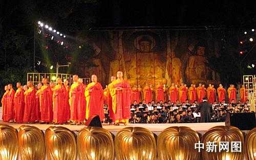 中新社韶關(guān)九月二十一日電(馮昶 李凌)九月二十日晚,素有禪宗祖庭之譽(yù)的廣東韶關(guān)南華禪寺廣場(chǎng)禪音繚繞。二00九禪宗六祖文化節(jié)在“壇經(jīng)梵音”音樂晚會(huì)的禪樂聲中開幕。來自中國(guó)內(nèi)地及港澳臺(tái)地區(qū)的諸山長(zhǎng)老及善眾四千多人參加了這次大型禪音樂會(huì)。