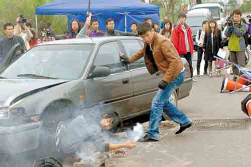 最驚險(xiǎn)的一幕是車輛爆炸之時(shí),雖然整部汽車都燃起了熊熊大火,卻未出現(xiàn)零件炸飛的情況。爆炸的道具十分簡(jiǎn)單,是劇組自制的“汽油彈”———在幾個(gè)空瓶?jī)?nèi)裝滿汽油,外加少許甲胺磷農(nóng)藥或白酒等物品,與幾個(gè)小“魚雷”捆綁在一起就能“爆炸”了。(記者 章琰)
