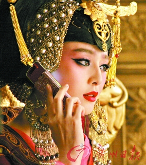電影中的這場(chǎng)戲,是范冰冰扮演的大明星王菁菁在拍片現(xiàn)場(chǎng)與男友通電話,還穿著戲服直沖到舞會(huì)現(xiàn)場(chǎng),古代與現(xiàn)代的反差制造出“穿越”的效果,極具喜劇感。劇組特別邀請(qǐng)到北京奧運(yùn)會(huì)開(kāi)幕式的核心造型師陳敏正打造這個(gè)古裝造型。