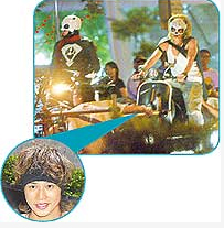臺灣“蘋果日報”消息,《熊貓人》2名男主角都是周董力挺的好友宇豪與彈頭,女主角則是“新版J女郎”江語晨,全是一家親。該劇日前在大直美麗華取景,他們戲服頗有卡通味,其中彈頭白汗衫配披風,頂著金毛佩戴熊貓面具,不像“熊貓人”,反倒像“金毛獅王”,騎的是復(fù)古偉士牌機車;相較之下,與他對戲的演員身穿特制的熊貓俠裝,騎的是周董山寨版蝙蝠機車,看起來還比較像真正的熊貓人。