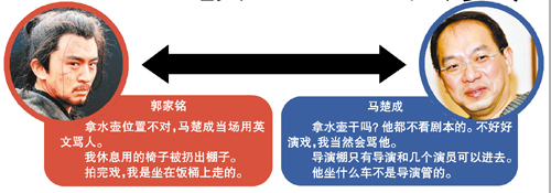 馬楚成感嘆說:“我入行多年,合作過那么多的演員,從來沒有投訴過我。我為什么說他,他是我遇到過的最差的演員。說他坐送飯的車離開片場,你覺得導(dǎo)演可以管得到一個演員坐什么車嗎?這不是導(dǎo)演管的事情。至于郭家銘投訴自己的椅子被扔的事,馬楚成笑道:“在片場為了保證拍片的秩序,導(dǎo)演棚只有導(dǎo)演、副導(dǎo)演和幾個演員,比如趙薇和陳坤可以進去看,但他非要沖進來,還跟工作人員吵架。算了,你就直接說我不作回應(yīng)好了,我作了回應(yīng)回頭還要說我?guī)退醋髂。”記者周?