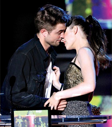 《新月》受追捧主要因?yàn)槟信惶柫_伯特·帕丁森與克里斯蒂·斯圖爾特的化學(xué)作用。而在戲外,兩人也是好萊塢的一對“明星情侶”。昨日,摘得“最佳接吻”獎的兩人當(dāng)場為在座觀眾獻(xiàn)上一吻,引來尖叫無數(shù)。