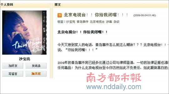 由于滿文軍吸毒案引起轟動(dòng)的緣故,北京電視臺(tái)近日再次報(bào)道明星吸毒事件,將沙寶亮04年卷入青島夜總會(huì)吸毒一事再度重提,并以主觀口吻稱(chēng)“沙寶亮涉嫌沾染毒品”、“沙寶亮至今仍不承認(rèn)吸毒”。前日,沙寶亮本人在個(gè)人博客上嚴(yán)正聲明:我從未沾染過(guò)任何毒品!并直接針對(duì)北京電視臺(tái)表示:“今天我最后一次很?chē)?yán)肅也很客氣地跟你說(shuō):你給我閉嘴!”