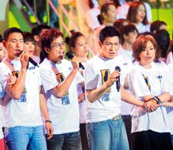 昨晚會(huì),劉德華從頭到晚穿梭在舞臺(tái)上,先與鄭秀文合唱〈喝采〉,再與任賢齊演唱臺(tái)語(yǔ)歌〈天下第一等〉鼓勵(lì)臺(tái)灣,稍晚也與譚詠麟、陳百祥、溫拿五虎演唱〈朋友〉,日前他自費(fèi)來(lái)臺(tái)賑災(zāi),連趕兩臺(tái),回港后又與曾志偉合辦“88水災(zāi)關(guān)愛(ài)行動(dòng)”,為臺(tái)灣出錢出力。