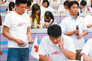 據(jù)“聯(lián)合早報(bào)”消息,香港演藝圈為了幫助臺(tái)灣受災(zāi)民眾盡快重建家園,積極動(dòng)員,與臺(tái)灣藝人聯(lián)手舉辦《88水災(zāi)關(guān)愛(ài)行動(dòng)》。劉德華水災(zāi)后第一時(shí)間飛抵臺(tái)灣賑災(zāi),返港后更是召集200位藝人,趕工錄制“88水災(zāi)關(guān)愛(ài)行動(dòng)”主題曲《滔滔千里心》。擔(dān)任總召的他,一下飛機(jī)便直奔活動(dòng)現(xiàn)場(chǎng),強(qiáng)打精神緊盯各個(gè)環(huán)節(jié),不但親手寫大字報(bào),更扯破喉嚨指揮全場(chǎng)。