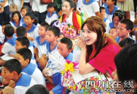 “小朋友們好,我是林志玲姐姐”“我是譚維維姐姐”“我是光良哥哥”……昨日上午,成都雙流星光熠熠,一場“愛在傳遞”安康家園兒童心系臺灣小朋友的活動在此舉行。林志玲、譚維維、曾寶儀、光良、江美琪、許慧欣、謝娜等遠(yuǎn)道而來,和孩子們一起,為臺灣因“莫拉克”臺風(fēng)受災(zāi)的小朋友祈福。晚上,譚詠麟、韓紅、陳小春等也馬不停蹄加入其中,在雙流體育中心舉行了“愛帶我回家”大型公益晚會,關(guān)懷與感恩,淚水與希望一齊播撒。