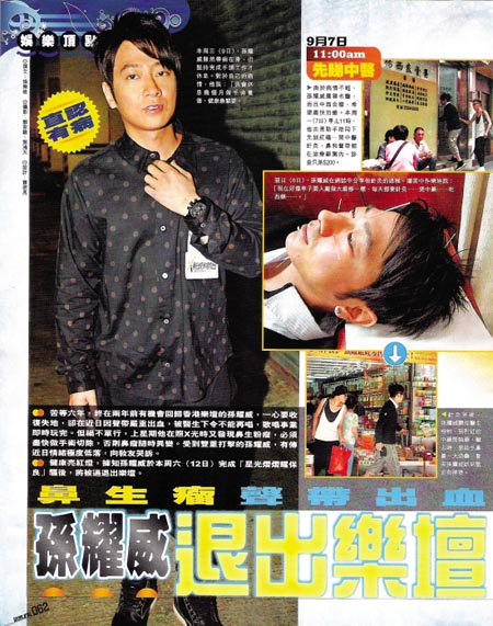 原本10月出唱片的孫耀威,上月忽然向所屬的環(huán)球唱片公司以聲帶不適為由,要求無限期押后錄音,并推掉一連串登臺(tái)工作。據(jù)知半年前,孫耀威發(fā)現(xiàn)每次表演后喉嚨便出現(xiàn)劇痛和紅腫,起初他以為是一般歌手常有的聲帶發(fā)炎,于是便戒酒救聲,但一直沒有好轉(zhuǎn),最近才被醫(yī)生證實(shí)是聲帶出血,每次唱歌都會(huì)引發(fā)聲帶微血管爆裂,喉嚨充血。聲帶出血將孫耀威的事業(yè)計(jì)劃全盤打亂,他原本計(jì)劃明年在臺(tái)灣出碟,如今都因病泡湯。