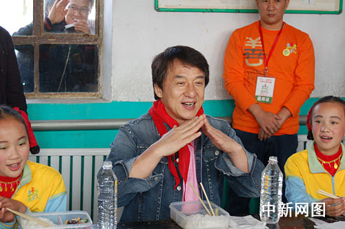 臨近午飯時分,成龍與十幾名小學童每人領到了一盒香菇炒油菜和白米飯的盒飯,在一間簡陋的教室里津津有味地吃了起來。雖然是頭一次與國際巨星成龍在一起吃飯,可這些鄉(xiāng)村娃娃卻一點也不怯場,好奇心驅(qū)使他們左一個問題右一個問題問個不完。而成龍卻面帶笑容地邊吃邊聊,將他的成長經(jīng)歷和成功經(jīng)驗耐心地一一解答。眾學童聽完后,紛紛夸“成龍叔叔好棒!”