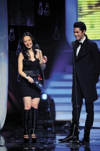 2009MTV超級盛典昨天在大劇院舉行。成龍、莫文蔚、WonderGirls、飛輪海齊齊成為座上賓,可誰都沒有阿嬌遭遇如此大的尷尬與障礙。先是因為贊助商與自己代言的品牌沖突,導(dǎo)致電視臺拍攝的畫面無法播出,后是在臺上與混血模特?zé)o法用英文順暢交流,令她在臺上連喊“尷尬”。
