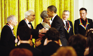 肯尼迪中心榮譽(yù)獎(jiǎng)是美國為表彰演藝界杰出人士而設(shè)置的終身成就大獎(jiǎng)。在本屆頒獎(jiǎng)典禮上,美國總統(tǒng)奧巴馬6日攜夫人米歇爾親自到場(chǎng)慶賀。對(duì)于五位獲獎(jiǎng)藝人,奧巴馬在致詞中表示:“這些藝術(shù)家確實(shí)是最棒的。他們是現(xiàn)世的提醒者,時(shí)刻告訴我們這一事實(shí)——在這里,我準(zhǔn)備借用米歇爾的一句臺(tái)詞——這些藝術(shù)并不只是我們國民生活的一部分,它們是我們國民生活的核心!
