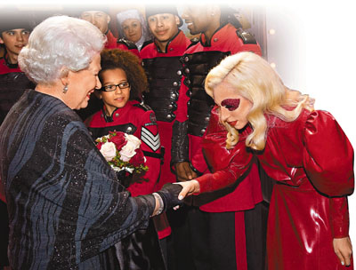 彩排結(jié)束后,英女王來到后臺逐一與有份演出的藝人見面,又跟他們握手以示支持。Lady GaGa受寵若驚般半蹲彎腰與英女皇握手,態(tài)度謙遜,與平日出位的她十分不同。