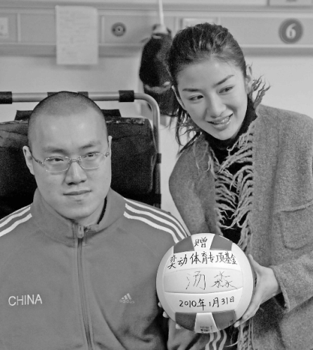為了感謝黃奕,湯淼執(zhí)意要贈送她一個親筆簽名的排球。黃奕拿著排球,湯淼左手握著筆,憑著前臂的力量用左手在排球上吃力地簽上了自己的名字。