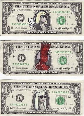 據(jù)外國媒體報道,美國流行音樂歌手、個性“舞后”lady gaga,如今可謂是紅得發(fā)紫,而她的影響力有多大?日前,美國一畫家,就將印有美國第1任總統(tǒng)喬治·華盛頓頭像的1美元鈔票,篡改成lady gaga的經(jīng)典造型。lady gaga享受到了一回和美國總統(tǒng)平起平坐的待遇。