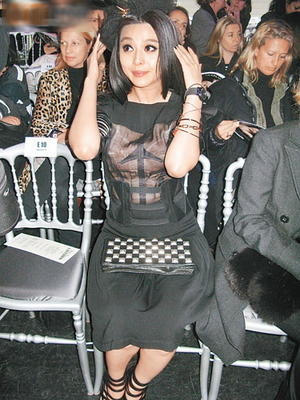 范冰冰于巴黎時間前日(3月6日)在當(dāng)?shù)匦蕾p時裝秀,穿上黑色透視裝的她,內(nèi)襯肉色三角錐體Bra(文胸),有型又新潮。