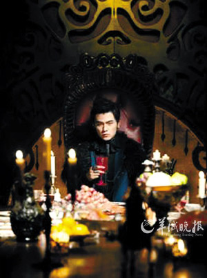 在新專輯預(yù)售海報上,周杰倫以一個中古世紀(jì)的吸血鬼扮相出現(xiàn)。只見他臉色蒼白,嘴唇鮮紅,穿一身西裝外套,還罩了一件羽毛披肩,坐在餐桌前若有所思,像是一個住在城堡中的神秘“吸血鬼王子”。造型師還在周杰倫的指甲貼上帶有鉚釘?shù)闹讣灼,讓握著酒杯的手流露出華麗感;眼睛里則戴上了特殊的隱形眼鏡,營造出一雙“電眼”,眼里還有動物般的直立橢圓瞳孔,詭異得令人戰(zhàn)栗。