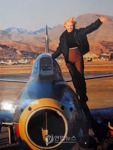 據(jù)“韓聯(lián)社”消息,照片中的夢(mèng)露身穿褐色褲子和黑色航空夾克衫,她在大邱K-2機(jī)場(chǎng)以八公山為背景,站在“F-84G”戰(zhàn)斗機(jī)左翼上面,并高舉左臂,臉上露出燦爛的笑容。照片大小是橫67厘米,豎59厘米。