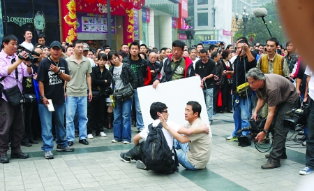 上午10點(diǎn)10分,記者趕到現(xiàn)場(chǎng)時(shí),解放碑下已經(jīng)聚集了數(shù)百群眾,不少人正在熱烈討論:“費(fèi)力抓到個(gè)小偷,結(jié)果是在拍戲嗦。”原來(lái),昨天的戲份是扮演張國(guó)立舞蹈老師的韓雨芹正在逛街,錢(qián)包被小偷偷了,“暗戀”老師的張國(guó)立發(fā)現(xiàn)后,奮勇抓住了小偷。一位工作人員告訴記者,一開(kāi)始拍攝的是遠(yuǎn)景,出場(chǎng)的是身著張國(guó)立同樣服裝的替身演員,為求真實(shí),攝影機(jī)和工作人員都離得比較遠(yuǎn),現(xiàn)場(chǎng)非常不好控制。記者看到,每當(dāng)替身演員大喊抓小偷時(shí),本該由扮演路人的演員出場(chǎng)一起圍抓小偷,誰(shuí)知總有不少路人以為真有“小偷”,上百人一擁而上,還有的出手打“小偷”,導(dǎo)演不得不數(shù)次叫停,最后連張國(guó)立都上前來(lái)營(yíng)救“小偷”。