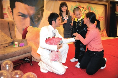 昨天,黃曉明的粉絲在京為他舉辦了一場(chǎng)名為“你在我心上”的慶生會(huì)。一個(gè)曾在福州受到黃曉明資助的聾啞小朋友金榕燊在母親的陪同下到場(chǎng)。金媽媽激動(dòng)地拉著孩子跪謝黃曉明,場(chǎng)面溫馨感人。