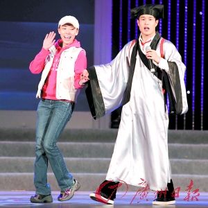 最讓人期待的小沈陽,雖然這次“爺們”了不少,沒再穿蘇格蘭格子裙,著一套黑色西服出場,但讓人驚喜的段子也就只有以水果比喻女人以及唱著粵語歌、背著喜羊羊書包扮寧采臣出場演《倩女幽魂》那一段,他和老婆沈春陽的調(diào)侃以及《大話西游》的小品依然是炒冷飯。不過,小沈陽一出場,觀眾的情緒就明顯高漲,還先后有兩位大膽女粉絲上臺送花獻(xiàn)吻,完全當(dāng)同臺的沈春陽“透明”。