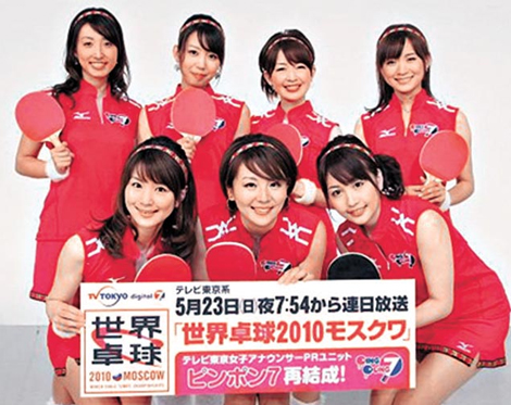 據(jù)香港媒體消息,“乒乓 7”是從電視臺內(nèi)美女主播中挑選,制作部今年初已委任 31歲的大橋未步擔當“乒乓 7”負責,由她親自操刀設(shè)計紅色超短裙!捌古 7”去年所穿的裙,被指太暴露,令很多女主播穿上后感到尷尬,今次電視臺特別指定 24歲的相內(nèi)優(yōu)香和秋元玲奈做示范。