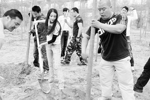 幾十位演員又是刨坑,又是澆水,雖然在劇中一個(gè)個(gè)都是“英雄好漢”,但面對(duì)小小樹(shù)苗卻沒(méi)了脾氣。對(duì)植樹(shù)一點(diǎn)不在行的他們,樹(shù)還沒(méi)植幾棵,就已經(jīng)累得大汗淋漓,有的人手上磨出了水泡,有的人手背被樹(shù)枝剮破。