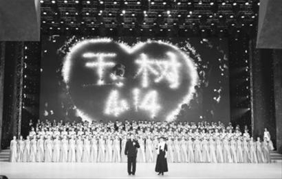 昨晚的《情系玉樹(shù),大愛(ài)無(wú)疆——抗震救災(zāi)募捐活動(dòng)特別節(jié)目》賑災(zāi)晚會(huì),以新聞事件為主線,串起文藝演出和募捐活動(dòng)。晚會(huì)按照時(shí)間的順序,穿插回放地震發(fā)生后的救援大事記,救援中的感人故事以及來(lái)自震區(qū)的報(bào)道,均出現(xiàn)在募捐現(xiàn)場(chǎng)。晚會(huì)一開(kāi)始,在主持人白巖松的呼吁下,現(xiàn)場(chǎng)全體人士集體默哀三分鐘,隨后由百余位文體、曲藝界明星演唱了《我們眾志成城》,王菲、那英等明星領(lǐng)唱。