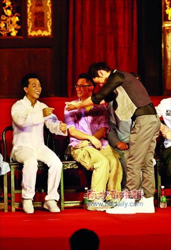甄子丹當(dāng)日以一身白色功夫裝亮相,在隨后的發(fā)布會(huì),眾多媒體見證了他一次收下黃曉明、釋小龍和蔣岱言三位徒弟!昂_x”出來的“小李小龍”蔣岱言現(xiàn)場耍雙截棍,還虎虎生威地打了一套拳。之后,黃曉明等三人一起向甄子丹敬茶致禮,場面十分溫馨。黃曉明說自己今后將多拍“打戲”,但有記者問:“你怎么一把年紀(jì)了才來學(xué)武術(shù)?”黃曉明笑言:“活到老學(xué)到老啦。男人應(yīng)該都會(huì)點(diǎn)功夫,有強(qiáng)壯的體魄,才能保護(hù)女人!”