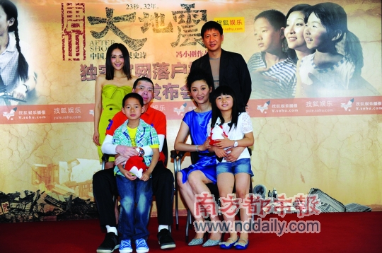 昨日,即將于7月22日在內(nèi)地、香港、臺灣同步上映的《唐山大地震》在搜狐網(wǎng)開通了電影官方網(wǎng)站,導(dǎo)演馮小剛攜主演徐帆、張國強(qiáng)等出席發(fā)布會與網(wǎng)友一同分享了他們關(guān)于30年前的記憶,并首度向外界公布了影片中“張國強(qiáng)、徐帆一家”的全家福照片。而在隨后的采訪中,馮小剛則否認(rèn)了徐帆因?yàn)槭亲约浩拮硬诺靡猿鲅荨洞蟮卣稹返膫髀,“徐帆的水平在那兒擺著,她撐起了這部電影的魂!蓖瑫r(shí),對于影片的票房,馮小剛再次放出豪言,“誰不服,就和《大地震》同天上映!”