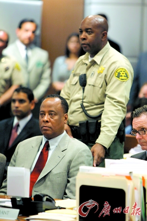 康拉德·默里在法庭上接受了簡短的訊問。身穿灰色西裝的康拉德·默里在法庭訊問過程中只是簡單地回答法官提出的問題。訊問結(jié)束后他被法警扣押,但在辦理了取保候?qū)彽氖掷m(xù)后離去,他支付了7.5萬美元的保釋金。