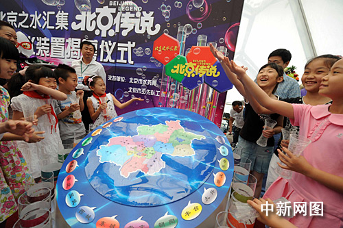 “北京之水匯集北京傳說”活動是圍繞北京兒藝六一大戲《北京傳說》中的節(jié)水環(huán)保主題而開展的、面向北京所有小學(xué)生及學(xué)齡前兒童的大型環(huán)保節(jié)水公益行動,F(xiàn)場12位節(jié)水小明星代表一起把他們從北京各水系取來的水標(biāo)本匯集到“北京之水”大型環(huán)保容水裝置中,這一裝置高1.5米,它以藍(lán)色水波紋狀物體為底座,上方圓弧狀轉(zhuǎn)盤中用顯著顏色標(biāo)識出北京水系分布情況,5月28日至6月1日《北京傳說》演出期間,該容器將放置在水立方場內(nèi),成為一道環(huán)保新景觀。