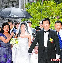 昨早9時男方以6輛奔馳車隊至女方家迎娶,親友幫新娘撐的卻是黑傘,依民間習(xí)俗,一般新娘出嫁時,親友會以米篩遮陽,如果是撐黑傘,多半意味新娘腹中有喜。問新人是否有喜時,他們只說“謝謝”,未正面回答。證婚人鳳凰衛(wèi)視主席劉長樂入場時,被媒體問:“小孩是男的?女的?”他也未作答。