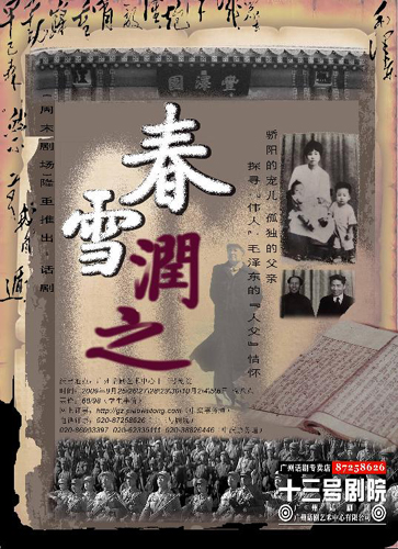 中新網(wǎng)廣州9月25日電 (記者 索有為) 毛澤東,驕陽的寵兒,孤獨(dú)的父親。由廣州話劇藝術(shù)中心出品的“建國(guó)大戲”——《春雪潤(rùn)之》將于今日晚在廣州十三號(hào)劇院面向公眾上演,用全新視角探尋偉人毛澤東的人父情懷、講述毛澤東的舐犢之情。