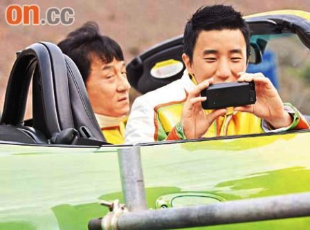 昨日清晨七時(shí),成龍與祖名穿超時(shí)空戰(zhàn)士的“父子裝”抵達(dá)青馬大橋,駕駛熒光黃色和綠色的左跑車,車尾則放了一大箱冰凍道具樽裝茶,非常搶眼。坐在司機(jī)位的成龍?jiān)诠飞巷L(fēng)馳電掣,狀甚威風(fēng),其實(shí)他們的跑車被固定在貨車托尾板上,相反攝影師要站在托尾板上拍攝,當(dāng)有大風(fēng)或大貨車經(jīng)過扯風(fēng)時(shí),令攝影師搖搖欲墜,驚險(xiǎn)萬分。