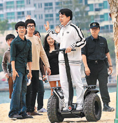 成龍忙拍電影、忙公益慈善,環(huán)保也是他重視的課題,由他代理的塞格威(SEGWAY)單人雙輪電動滑板車,將成為圣淘沙主要代步工具,昨天成龍抵達(dá)到新加坡推廣這活動,目前圣淘沙引進(jìn)50臺,并計劃在兩年內(nèi)增加至200臺,讓旅客隨意往來島上各景點。