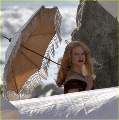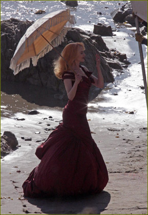 妮可·基德曼2月19日在洛杉磯的某海灘上為某雜志拍攝宣傳寫真,當(dāng)天的妮可·基德曼化身中世紀(jì)的貴婦,穿著暗紅色的絕美長(zhǎng)裙,襯得身材玲瓏,肌膚透白,手中的陽傘更是增添了高貴優(yōu)雅,和妮可·基德曼得天獨(dú)厚的氣質(zhì)完全符合。