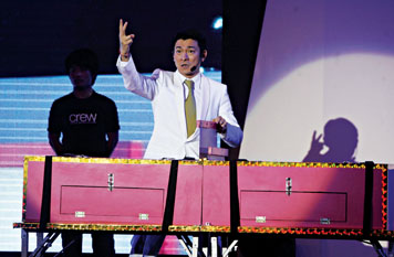 劉謙變魔術(shù),那是他的老本行,而劉德華就純粹是客串了,但在舞臺上的一招一式,劉德華倒并不業(yè)余。第一個魔術(shù)請出了他的“女朋友 ”:“她是我今天的女朋友哦!边呎f邊摸著美女的手,“為了公平起見,我要邀請媒體朋友一起來參與!薄斑有你,美女,我喜歡漂亮的……”還沒開始變魔術(shù),之前的噱頭已擺得夠足。“將美女關(guān)在盒子里,用鋒利的刀等工具往下插,然后盒子分離,人也就此被分尸……”表演內(nèi)容并不陌生,但出自華仔之手,粉絲們看得津津有味,尖叫聲不斷!華仔究竟用了多少時間學(xué)會變這個魔術(shù)的呢?“這個是秘密,不能告訴你們!惫首魃衩氐娜A仔透露說,自己曾經(jīng)上過劉謙的節(jié)目,也跟他學(xué)了幾招。