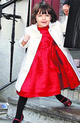 蘇瑞常穿一雙金色娃娃鞋,這雙鞋出自法國(guó)知名童裝品牌“Bonpoint”,要價(jià)230美元。但凱蒂自己卻不求奢華,75美元的黑白格子風(fēng)衣她穿得很開(kāi)心,阿湯哥的舊牛仔褲更是連穿好幾周,意外帶動(dòng)流行。