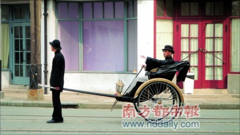 前天,《建國大業(yè)》的拍攝場地就在車墩影視基地的“南京路”,既然拍的是上海戲,當時上海灘的大佬杜月笙就自然成了重要人物。昨天,馮小剛的“任務(wù)”就是坐在黃包車上,后面跟著一幫人馬,在“南京路”上拉風地走過去。馮小剛戴著帽子,鼻梁上架著圓圓的老式墨鏡,拎著一個拐棍,他的黃包車,也被做成了鍍金的。黃包車后面,跟著20多個黑衣保鏢,派頭十足。這個造型,讓人不免想起了《功夫》中馮小剛客串的鱷魚幫老大。