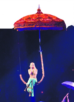 3月初,“小甜甜”布蘭妮展開她的復(fù)出巡回演唱會(huì), 多變的造型堪比麥當(dāng)娜,內(nèi)衣外穿,野蠻女警等造型都堪稱火辣。為配合新專輯《馬戲團(tuán)》,布蘭妮打扮成馬戲團(tuán)表演者,在舞臺上奉獻(xiàn)了很多雜技表演,她還蒙上眼睛與兩名男舞者一起跳舞一起演唱《Touch of My Hand》。她在高空坐在“傘柄”上以印度舞娘造型出場,遠(yuǎn)看甚為驚艷,近看發(fā)現(xiàn)她腹部堆積著贅肉,跳肚皮舞倒是不錯(cuò)?磥聿继m妮還需要減肥。
