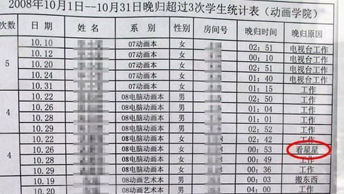 近日,北影校園內(nèi)張榜公布了各系晚歸同學(xué)的名單,把超過3次晚歸的學(xué)生和詳細(xì)原因都公布了出來。在網(wǎng)友上傳的晚歸名單中,晚歸的理由有“電視臺(tái)工作”、 “吃飯”、“回家”、“拍戲”等,最讓網(wǎng)友意外的是有一名同學(xué)的晚歸理由是“看星星”。根據(jù)網(wǎng)友上傳的這份晚歸名單,“看星星”的這名女同學(xué)在2008年 10月26日晚第四次晚歸,接近凌晨1點(diǎn)才回宿舍。