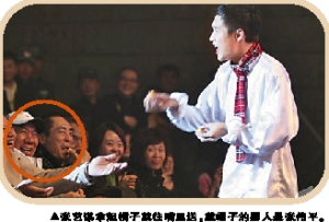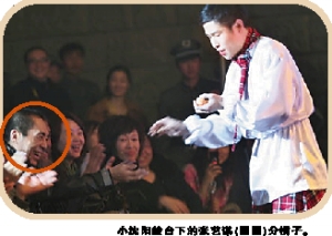 趙家班也乘興拿張藝謀砸掛:閆光明唱起了《我和你》;小沈陽則對(duì)妻子沈春陽說:“咱夫妻這么多年了,感情又這么好,人是沒法換了,但還不許咱改名嗎?你就叫鞏俐,你就叫章子怡!”沈春陽單獨(dú)表演時(shí),小沈陽在旁邊“不拾閑”地吃水果,還跑到前排觀眾席,把手里的橘子和蘋果分給張藝謀和他的團(tuán)隊(duì),張導(dǎo)也毫不客氣,立即吃下肚子給足小沈陽面子。據(jù)悉演出結(jié)束后,張藝謀還去休息室和小沈陽寒暄一番。