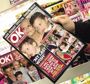 視臺播出。她于2月22日和男友杰克·特威德舉行婚禮。據(jù)報道婚禮報道權(quán)以100萬英鎊(約合140萬美元)價格出售。她還通過接受專訪、撰寫“抗癌日記”等形式獲取報酬,目的是為了讓兩個年幼的兒子未來更有保障。