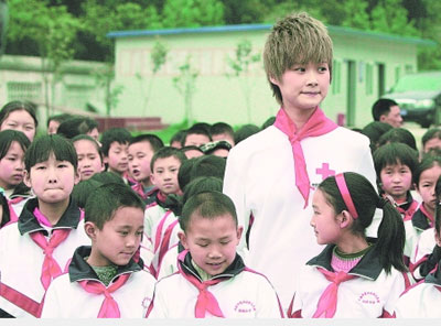 昨日下午,李宇春來(lái)到都江堰向峨鄉(xiāng)海虹小學(xué),在這里,戴上紅領(lǐng)巾的她和小學(xué)生們一起,手牽手面對(duì)鏡頭。剛開始春春牽著小朋友的手還有點(diǎn)不自在,她坦言:“和小朋友在一起我有點(diǎn)緊張,因?yàn)閯傞_始不太熟悉,可能有點(diǎn)拘謹(jǐn)!北M管一直活躍在舞臺(tái),和影視劇并沒有太多接觸,只是一些客串演出,但春春面對(duì)鏡頭卻顯得非常鎮(zhèn)定,臺(tái)詞功夫也十分了得。
