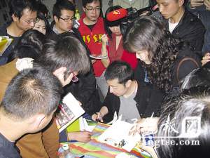 記者發(fā)現(xiàn)一位男青年手里抱著一堆書,忙前忙后地見人就問,你是賈導的影迷嗎?他告訴記者,他叫徐鑫,是賈樟柯影迷聯(lián)盟的成員,在北京讀大學時就喜愛看賈導的電影,聯(lián)盟的成員委托他來南京幫著要簽名,“有陜西、山西,還有江蘇無錫、常州的,這些書是幫他們簽的! 徐鑫說,他此次來還有一個任務(wù),就是發(fā)展成員!奥(lián)盟剛剛成立不久,只有七八十人,今天收獲不小,至少有40多人表示愿意加入!庇浾邌査麑ΜF(xiàn)場火爆的情形怎么看,他認為,不排除有些大學生根本就沒看過賈導的電影和書,是來趕熱鬧的,把他當成了偶像。